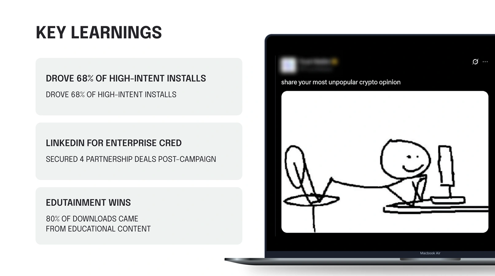 We wanted to build real community trust in a market that’s already crowded and skeptical. Our strategy focused on simplifying the complex world of Web3 for beginners while using influencer reviews and founder thought leadership to prove we were the secure, user-friendly choice.